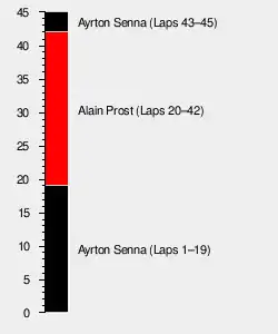 - Ayrton Senna 21 (1–19, 44–45), Alain Prost 24 (20–43)