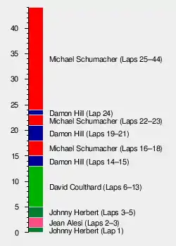 The race was attended by in excess of 100,000 people.[1] Schumacher and Hill both qualified further down the grid than usual in a wet-dry qualifying session, but fought back during the race. Both Jean Alesi and Johnny Herbert briefly led the race, but Alesi broke down and Herbert struggled for pace once the track was dry. Polesetter Gerhard Berger struggled before dropping out.