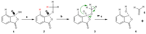 The reaction mechanism for an oxidation of an alcohol to an aldehyde according to the hypervalent twisting mechanism[4] involves a ligand exchange reaction replacing the hydroxyl group by the alcohol followed by a twist and an elimination reaction. The twist is a requirement because the iodine to oxygen double bond is oriented out of plane with the alkoxy group and the concerted elimination would not be able to take place. This twist reaction is a rearrangement in which the oxygen atom is moved into a proper plane for a 5 membered cyclic transition state in the elimination reaction and is calculated by Computational chemistry to be the rate-determining step in the oxidation. The twist mechanism also explains why oxidation is faster for larger alcohols than for small alcohols. The twist is driven forward by the steric hindrance that exists between the ortho hydrogen atom and the protons from the alkoxy group and larger alkoxy groups create larger steric repulsion. The same computation predicts a much faster reacting IBX derivative with a 100 fold reaction rate when this ortho hydrogen atom is replaced by a methyl group thus facilitating the twist until the elimination reaction takes prevalence as the rate determining step.