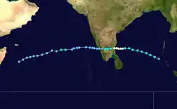 By November 28, a 20 km (12 mi) wide eye was developing, prompting the JTWC to upgrade the storm to the equivalent of a minimal hurricane with winds of 120 km/h (75 mph). By comparison, the IMD estimated peak winds of 190 km/h (115 mph). Wind shear in the region prevented further strengthening, and the storm weakened slightly before making landfall on November 29 in eastern India near Cuddalore. A station there recorded a pressure of 983 mbar (29.0 inHg). The storm rapidly weakened over land, and degenerated into a remnant low on November 30. The remnants emerged into the eastern Arabian Sea on December 1, by which time most thunderstorms had dissipated over the deteriorating center. Two days later, the JTWC reissued advisories, based on an increase in outflow and convective organization. This was short-lived, as the thunderstorms soon dwindled, and the JTWC ceased issuing advisories on December 5. The remnants continued westward without development toward eastern Somalia, before they were last noted on December 6.[1][3]