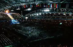 The opening ceremony of the 2000 Summer Olympics took place on the evening of Friday 15 September 2000 in Stadium Australia, Sydney, during which the Games were formally opened by Governor-General Sir William Deane. As mandated by the Olympic Charter, the proceedings combined the formal and ceremonial opening of this international sporting event, including welcoming speeches, hoisting of the flags and the parade of athletes, with an artistic spectacle to showcase the host nation's culture and history. Veteran ceremonies director Ric Birch was the Director of Ceremonies[1] while David Atkins was the Artistic Director and Producer.[2] Its artistic section highlighted several aspects of Australian culture and history, showing Australia's flora and fauna, technology, multiculturalism, and the hopeful moment of reconciliation towards Aboriginal Australians.[1][3] The ceremony had a cast of 12,687 performers,[4] seen by a stadium audience of around 110,000.[3]