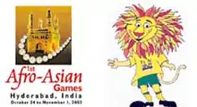 ![]() Logo (left) and mascot (right) of the 2003 Afro-Asian Games. The logo shows the Charminar, Hyderabad's most famous landmark, surrounded by a string of pearls. The mascot is Sheroo, a cartoon representation of the royal Bengal tiger, India's national animal. | |