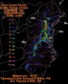 Extensive river flooding was reported in dozens of communities in eastern Pennsylvania. Over 70 people had to be rescued from rooftops by U.S. Coast Guard helicopters after being stranded by the floodwaters.[2]
