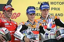 Loris Capirossi, Dani Pedrosa and Nicky Hayden, celebrating on the podium after finishing second, first and third in the MotoGP race.