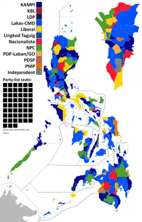 The administration's two main parties, Lakas-CMD and Kabalikat ng Malayang Pilipino (KAMPI), was seen to win majority of the seats, with most contests contested by the two parties. This inevitably produced a split in the administration ranks on who would be their candidate for Speaker in the impending victory. However, the two parties were united in supporting President Arroyo and were able to prevent any impeachment proceeding against her or her allies from reaching the Senate.