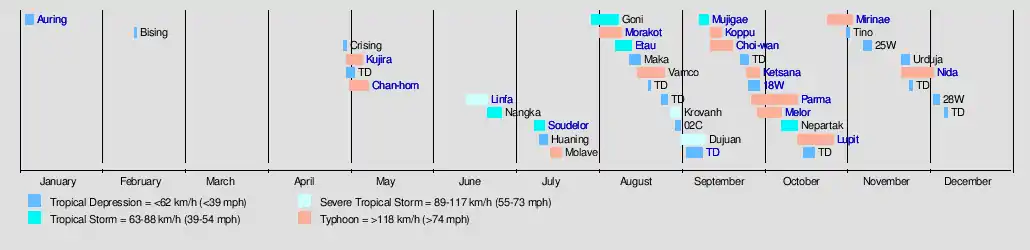 The 2009 Pacific typhoon season was a below average season that spawned only 22 named storms, 13 typhoons, and five super typhoons. It was also recognized as the deadliest season in the Philippines for decades. The first half of the season was very quiet whereas the second half of the season was extremely active. The season's first named storm, Kujira, developed on May 3 while the season's last named storm, Nida, dissipated on December 3.
