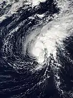 Early on April 26, an area of disturbed weather formed near the coastline of Baler, capital of the Philippine's Aurora province. It was formerly a tail end of cold front that passed by Northern Luzon. JTWC assessed that the area of a disturbed weather potential of becoming developing into a significant Tropical Cyclone within 24 hours as "fair". However, on April 28, JTWC downgraded the disturbance as dissipating because of interaction with nearby middle Tropical Depression Crising and JMA Tropical Depression 03. A few days later, the disturbance moved south-westward, and late on April 30, the disturbance made landfall at Albay. On May 1, JTWC again upgraded the disturbance into having a potential to form into a significant Tropical Cyclone within 24 hours to "fair". And later that day, PAGASA classified the disturbance as a tropical depression, naming it "Dante" and issued public storm warning signal number one in the provinces of Camarines Norte, Camarines Sur, Albay, Sorsogon, Catanduanes, Masbate, Burias Island, and Southern Quezon.[39] PAGASA also reported that Dante made landfall in the vicinity of Sorsogon within the Bicol region of the Philippines. Early on May 2, JTWC issued a TCFA as the depression was in an almost stationary position. Later that day, JMA classified Dante as a full depression. Early the next morning it became a tropical storm and was named Kujira. Kujira continued to strengthen and was upgraded to a severe tropical storm that afternoon. When it was over the Philippines it killed 27 people while 9 others are missing.[40] The JMA upgraded the system to a typhoon early on May 4. Kujira intensified quickly, doubling in strength from a Category 2 typhoon to a Category 4-equivalent typhoon within 24 hours. On May 6, The JTWC reported that Kujira was in its beginning stages of becoming extratropical, with the low-level circulation center almost fully exposed in association with increasing vertical wind shear and lower sea surface temperatures in the region. Late that, JMA downgraded Kujira to a Severe Tropical Storm as strong wind shear weakens the system. Then early on May 7, JTWC issued its last advisory on Kujira, already reporting it as an extratropical system. JMA continued to issue warnings on the system while at the same time it was downgraded to a tropical storm. Later on May 7, Kujira weakened further, becoming a fully extratropical cyclone .