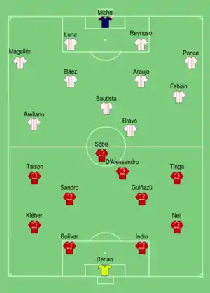 The first leg of the finals was seen by 49,500 spectators although they weren't all seated by the time Baldassi blew his whistle.[5] The first 15 minutes started with Internacional dominating the match, as Chivas struggled to create any rhythm.[5] Chivas subsequently started to settle into their play and knocked the ball around fluently, but struggled to find an entrance against a dogged Colorado backline.[5] The away side on the other hand continued to threaten out wide, and came close to scoring on the half-hour when Taison was pulled down on the edge of the area.[5] Alecsandro’s kicked a free kick that saw the ball hit the bar and bounce out of play.[5] The Mexicans did manage to test Renan for the first time shortly after, the Internacional keeper reacting smartly to cut off Omar Bravo when the striker was played through behind the defence.[5] The Colorados suffered a setback when striker and top scorer Alecsandro hobbled off injured to be replaced by Everton, but the Porto Alegre outfit continued looking the more dangerous team.[5] With the last touch of the half however, Chivas struck against the run of play.[5] The Mexican midfield combined smartly on the edge of the area to release Marco Fabián, and his chipped pass found Adolfo Bautista; the midfielder looped a header in from outside the area, leaving the Inter keeper scrambling back in vain.[5]