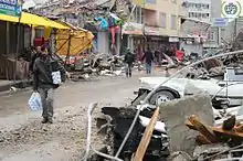 The earthquakes affected much of eastern Turkey, demolishing hundreds of buildings and burying numerous victims under the rubble. Erciş, a town near Van, was hardest hit by the violent shaking; at least 55 destroyed buildings, 45 fatalities, and 156 injuries occurred in the town alone.[17] Most of the buildings collapsed along the town's main road and were residential, raising the possibility of a higher death toll. In smaller villages near the epicenter, the shaking demolished almost all the brick houses.[18]