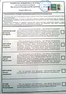 The 2012 Russian presidential election was held on 4 March 2012.[1] There were five officially registered candidates: four representatives of registered parties, and one nominal independent.