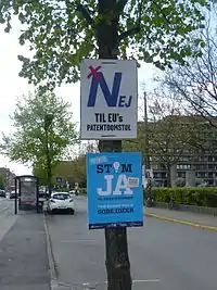The Danish Ministry of Justice issued its opinion in May 2013 that a referendum or five-sixths majority in the Folketing was necessary for the government to ratify the agreement due to constitutional requirements on the transfer of sovereignty.[2][3] The Danish People's Party (DF) and the Red–Green Alliance, collectively controlling around one-fifth of the Folketing seats, stated their opinion that a referendum should be held.[2] The People's Party said they would support the UPC if the governing parties promised to either hold a referendum on the proposed EU Banking Union or increase restrictions on the distribution of welfare benefits to foreign nationals in Denmark.[4] Despite being implored to negotiate with the DF by the leader of the opposition Lars Løkke Rasmussen, the government opted to hold a referendum,[1] announcing in December 2013 that one would go ahead on 25 May 2014.[5]
