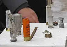 A report published on 25 January by Armament Research Services, a specialty arms and munitions consultancy in Perth, Australia, says the mysterious cufflink-shaped projectiles presumably fired by riot police on Hrushevskoho Street at protesters during clashes this week are not meant for riot control, but for stopping vehicles, busting through doors and piercing armor. The bullets, writes Jenzen-Jones, who specializes in Eastern bloc weapons, are special armor-piercing 12-gauge shotgun projectiles, likely developed and produced by the Spetstekhnika (Specialized Equipment) design bureau, a facility located in Kyiv and associated with the Ministry of Internal Affairs.[125]