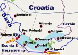 Croatia was affected by the floods to a lesser extent than Serbia or Bosnia.[49] The most critical area was in southern Slavonia. The embankment on the Sava River was breached near Rajevo Selo and Račinovci, and thus evacuation was ordered for Gunja, Rajevo Selo and Račinovci. As of 19 May, around 15,000 people in easternmost parts of Croatia were evacuated from their homes.[50] One of the most critical points was the embankment of the Sava river in Slavonski Šamac, where the confluence of the Bosna and Sava is located. At that point the embankments were under severe pressure caused by the huge amount of water coming from Bosnia. Several officials stated that if this embankment were breached, the entire region of southern Slavonia, with a population of over 300 000, would be flooded.[51] There were also floods in Banovina region, in the towns of Hrvatska Kostajnica and Dvor, mostly caused by the river Una, whose level had not been as high since 1955.[52] Video: http://vimeo.com/96164094