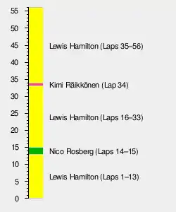 The top three began to spread out in the second half of the race, and by lap 54 Lewis Hamilton was leading Rosberg by 10.06 seconds, with Vettel a further 12.12 seconds behind Rosberg.[17] However, due to Ferrari's earlier attempt to undercut Rosberg by pitting Vettel early, Räikkönen's tyres were 4 laps fresher than his teammate's, and he closed in on Vettel over the final stint. Having emerged from his final pit stop 4.84 seconds behind Vettel on lap 35, Räikkönen had closed the gap to 1.37 seconds by lap 54.[17] However, the chance of a battle between the Ferrari teammates was extinguished after a transmission failure on Max Verstappen's Toro Rosso, who was stranded on the start/finish-straight, brought out the safety car for the final two laps, meaning that the race ended under safety car conditions.