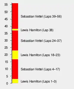 Both Mercedes cars now made their way through the field, with Hamilton overtaking Hülkenberg for second position on the end of lap ten, now ten seconds down on race leader Vettel. Rosberg reached third position on lap 14, while Hamilton was unable to make significant gains on Vettel in front. The cars that had not used the safety car phase for their stops began to change tyres on lap 16, while Maldonado was handed a ten-second penalty for exceeding the safety car time. Meanwhile, the Red Bull cars showed signs of brake problems with brake dust exiting the wheels at the major braking points on both cars. Vettel came in for his first stop on lap 18, handing the lead back to Hamilton. Vettel rejoined in third place and began to close rapidly on second-placed Rosberg. Vettel made good use of his fresher tyres, overtaking Rosberg on lap 22 and setting out to do the same on Hamilton, shortly before the latter went into the pits for his second pit stop on lap 24. Meanwhile, Fernando Alonso retired due to engine problems on lap 21 while running in ninth place. With deteriorating front wing damage, Daniel Ricciardo let his teammate Daniil Kvyat through into eleventh place on the beginning of lap 26,[46] only for Kvyat to be sent in a spin by Hülkenberg, who ran wide and hit the Red Bull in turn two. Both drivers were able to continue.[47] The other Force India of Pérez sent Romain Grosjean's Lotus into a spin five laps later. Both Force India drivers were handed a ten-second penalty for their actions.[46]