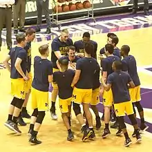 On November 4, the team played an exhibition game against Armstrong State, winning 77–49. Wagner and Irvin led the team with scoring in the exhibition with 15 points each.[66] Muhammad-Ali Abdur-Rahkman sat out the exhibition with an ankle injury.[67] Michigan opened the season on November 11 against Howard, winning 76–58. Derrick Walton led the team in scoring with 20 points, including four three-pointers, while D.J. Wilson led the team in rebounding with eight rebounds to go along with nine points playing in 20 minutes off the bench. Additionally, Rahkman returned from his ankle injury reclaiming his spot in the starting line-up.[68] On November 13, Michigan defeated IUPUI, 77–65. Zak Irvin led the team in scoring with 15 points, as four Wolverines finished the game with double-digit points, while Wilson led the team in rebounds with 14, to go along with seven points and five blocks playing in 30 minutes off the bench.[69] In the semifinal round of the 2016 2K Sports Classic held at Madison Square Garden on November 17, Michigan defeated Marquette 79–61 behind a team-high 16 points from Irvin and 4 other double digit scoring efforts, including D. J. Wilson's first career double-double (10 points and 12 rebounds).[70][71] The following night, Michigan won the tournament by defeating SMU 76–54. Walton made seven three-point shots and scored 23, while Irvin added another 16 to earn tournament MVP.[72][73] On November 23, Michigan suffered its first loss of the season to South Carolina, 46–61. Michigan was led by Walton with a team-high 15 points. Michigan scored 24 of its 46 points from the free throw line, shooting just 19 percent (10-for-52) from the field, including 2-for-26 from three-point range.[74] On November 26, Michigan defeated Mount St. Mary's, 64–47. Michigan was led by Irvin with 14 points, as the Wolverines used a 25–4 run to turn a four-point deficit into a 17-point halftime lead.[75] On November 30, Michigan lost to Virginia Tech 70–73 in the ACC–Big Ten Challenge. Michigan was led by Irvin with a game-high 23 points, as the Hokies rallied from a nine-point deficit at halftime to take their first lead of the game with 1:46 remaining and hold on to win.[76]