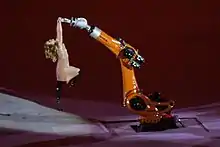 A segment representing vision called "Beyond Vision" created by the Brazilian light artist Muti Randolph[16] featured dancers dressed in black while carrying white light sticks, followed by a routine by a pair of partially-sighted dancers aided by a tactile floor.[7][8] This was followed by segments paying tribute to the sports that would be featured during the Games.[7] The Paralympic emblem was formed on the arena floor, followed by the entry and raising of the Paralympic flag; the flag was brought in by members of the Associação de Assistência à Criança Deficiente (an organization for disabled youth), and a montage of Paralympic athletes was played while the flag was raised. Following the taking of oaths, dancer and Paralympic snowboarder Amy Purdy, dressed in a 3D Printed Dress designed by fashion designer Danit Peleg, performed a dance routine with a KUKA robotic arm, which symbolized the co-existence of humans and technology.[17][18][15]