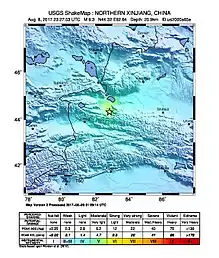 The 2017 Jinghe earthquake occurred at 07:27 China Standard Time (CST, UTC+8) on 9 August 2017, in Jinghe County, Bortala Mongol Autonomous Prefecture, Xinjiang Uyghur Autonomous Region, China, with magnitude 6.6 and depth 11 kilometres. The epicentre was 44.27°N 82.89°E.[5] Most cities in northern Xinjiang felt the quake.[1][2] This earthquake occurred on the Tian Shan seismic zone. There was no direct relationship to the earthquake in Jiuzhaigou County that occurred the previous day.[6][7]