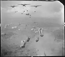 The first large airdrop mission by Mule Train took place on 28 June 1962. Sixteen C-123s accompanied by a dozen Douglas C-47 Skytrains of the Republic of Vietnam Air Force (VNAF) dropped paratroops about 35 miles north of Saigon despite a 500-foot ceiling. The Providers even added napalm bombing to their mission. The plane would carry nine wooden pallets, each holding three 55-gallon drums of napalm mixed with gasoline. With a good kicker, the load could go out the back ramp in less than five seconds and leave a pattern of flame 1,200 feet long.[16]