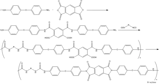 A specific reaction involving industrial use of 4,4’-oxydianiline is in the production of thermostable poly(amideurea) acids, which can be prepared from 4,4’-oxydianiline, pyromellitic dianhydride, and diisocyanates. These poly(amideurea) acids can be used as intermediates in the syntheses of poly(imideurea)s:[2]