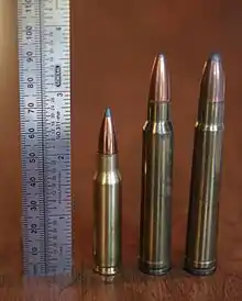 ![]() 8mm Remington Magnum (center) with .308 Winchester (left) and .375 H&H Magnum (right). | ||||||||||||||||||||||||