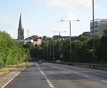 The A61 travels into Sheffield through Grenoside and Hillsborough, passing next to the Sheffield Wednesday football stadium as Penistone Road. It continues down to Shalesmoor and at this point it forms a major artery into the City Centre from the north, becoming the Sheffield Inner Ring Road (which is labelled as A61 all the way around). It meets the A57 twice; at Park Square and Brookhill roundabout. At Junction 4 (Bramall Lane) of the Sheffield Inner Ring Road, is a spur road the A621 - Bramall Lane, this road takes you past the western side of Sheffield United F.C.'s stadium and back onto the A61 as Queens Road. The A621 is used as a shortcut, instead of continuing on the Sheffield Inner Ring Road to Junction 3 (Granville Square), where it meets Queens Road further north. The A61 then continues through Heeley as Chesterfield Road and climbs up to Norton and onto Bowshaw roundabout. Between Sheffield and Chesterfield it is a dual carriageway, avoids Dronfield and Unstone as the eponymous by-pass. The road used to go through Chesterfield town centre, passing by the famous crooked spire, but was heavily congested. This was alleviated by the construction of the Chesterfield bypass in the 1980s on the alignment of the former Great Central Railway. The road reverts to single carriageway south of Chesterfield, passing through Clay Cross and Alfreton.