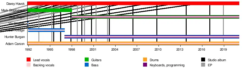 AFI (abbreviation for A Fire Inside) is an American rock band from Ukiah, California, formed in 1991. Since 1998, it consists of lead vocalist Davey Havok, drummer and backing vocalist Adam Carson, bassist, backing vocalist and keyboardist Hunter Burgan, and guitarist, backing vocalist and keyboardist Jade Puget.[1] Havok and Carson are the sole remaining original members. Originally a hardcore punk band, they have since delved into many genres, starting with horror punk and following through post-hardcore and emo into alternative rock and gothic rock.