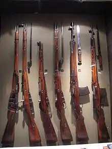 The rifle first saw service in the Battle of Khalkhin Gol, and later in the Winter War, but did not perform well. Some of the problems were caused by incorrect maintenance; many rifles went into combat without having been cleaned of their storage grease, which then "froze" solid. About 300 AVS-36 examples were captured by the Finns;[5] some were used by their new owners.[6] The SVT-38s and LS-26s used on the Finnish side suffered from similar problems. After a large amount of the more serviceable SVTs were captured, the AVS-36s were largely withdrawn from service. In the Soviet Union, the AVS was quickly marginalized and apparently withdrawn from service during 1941, though it saw brief service during World War II. Some reports claim that remaining AVSs were mostly scrapped. The US Ordnance Corps tested the weapon in the early 50s along with several SVT rifles. They noted that in addition to the Soviet's findings, the weapon's gas system, which had a sleeve that moves around the rear sight, also had a habit of loosening the rear sight over time resulting in inaccuracy.[7] Today, the AVS-36 is a rare collector's item; most of the remaining rifles in existence are in Finland.