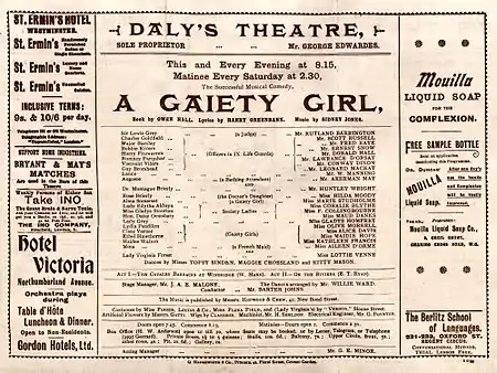 A Gaiety Girl is an English musical comedy in two acts by a team of musical comedy neophytes: Owen Hall (book, on an outline by James T. Tanner), Harry Greenbank (lyrics) and Sidney Jones (music). It opened at Prince of Wales Theatre in London, produced by George Edwardes, on 14 October 1893 (later transferring to Daly's Theatre) and ran for 413 performances. The show starred C. Hayden Coffin, Louie Pounds, Decima Moore, Eric Lewis, W. Louis Bradfield, and later Rutland Barrington, Scott Russell, Huntley Wright, Marie Studholme and George Grossmith, Jr. Topsy Sinden and later Letty Lind danced in the piece. Choreography was by Willie Warde. Percy Anderson designed the Japanese costumes for the musical, while the non-Japanese costumes were supplied by leading fashion houses.[1] Blanche Massey was one of the Gaiety Girls in the piece. It also had a successful three-month Broadway run in 1894, followed by an American tour and a world tour.