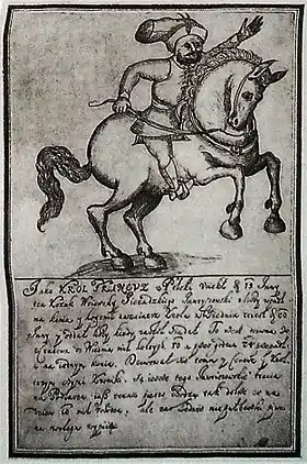 A fragmentary Wallachian chronicle, copied by Stoica Ludescu, describes all such allegations of treason as "mendacious charges".[125] Similarly, Xenopol notes that the accusation itself is incongruous, since Aaron had already made a public show of his disdain for Murad. He believes that Prince Báthory was in fact angered by Aaron having declined to swear fealty during a public ceremony, which was set to take place in Transylvania.[126] A Transylvanian diplomat, Kristóf Keresztúri, had brought back news that Aaron only recognized as his sovereigns "the Pope and His Sacred Imperial Majesty", viewing Báthory as a mere colleague.[127]