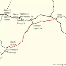 The Abakan-Taishet Railway is a railway built between 1959 and 1965, connecting Abakan with Tayshet on the Trans-Siberian Railway. It lies in Krasnoyarsk Krai along with parts of the Republic of Khakassia and Irkutsk Oblast. The line is a continuation of the Novokuznetsk - Abakan Railway which was built between 1949 and 1950. Construction of the Abakan-Taishet Railway was announced as a Komsomol shock construction project, and young workers came from all parts of the Soviet Union to build the line.