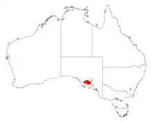 It is found on the southern and eastern sides of the Eyre Peninsula in South Australia[1] on sandplains and gently undulating hills to the north of Cowell[2] where it grows in red sandy soils as a part of mallee and low shrubland communities.[1] The wattle is commonly associated with Eucalyptus incrassata, Melaleuca uncinata and Triodia irritans. It is restricted to an area approximately 8 km2 (3.1 sq mi) and has an estimated population a few hundred to 5,000 individual plants. The shrub also situated on roadsides and in adjacent farming land.[4]