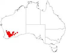 It is native to an area in the Wheatbelt and Goldfields-Esperance regions of Western Australia where it is found growing in sandy or gravelly sandy soils.[1] The distribution of the bulk of the population the shrub extends from around Wyalkatchem and Chiddarcooping in the north down to around Ongerup and Frank Hann National Park with outlying populations found as far east as Coolgardie as a part of mallee communities.[2]