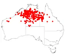 The plant will grown in red sand, loam and clay soils, it is found on plains and stony hills.[1] It is found mostly in tropical areas in the Kimberley region of Western Australia, the Northern Territory and northern Queensland. It is usually part of in open Eucalypt and Acacia woodland, low scrub or spinifex grassland.[2]