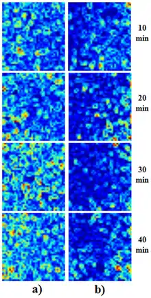To differentiate the sound and eroded tissues, contrast analysis was performed of the speckle patterns in the images. Since this analysis is, in its essence, the ratio of the standard deviation and average intensity, the LASCA map of the lesion is generally higher than in sound tissue. This phenomenon is demonstrated in the LASCA maps which show the greater prevalence of dark blue on the right side, indicating sound tissue, and lower prevalence on the left side, indicating eroded tissue.[26][27] The contrast ratio of the LASCA maps demonstrates that laser speckle images are sensitive to even small changes in the microstructure of the surface.