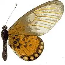 Acraea admatha, the Hewitson's glassy acraea, is a butterfly in the family Nymphalidae. It is found in southern Nigeria, Cameroon, Equatorial Guinea, Gabon, the Republic of the Congo, northern Angola and the western part of the Democratic Republic of the Congo.[2] The habitat consists of forest edges, secondary forests and agricultural areas with a full canopy.