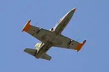 A long, pointed nose leads back to the tandem cockpit, in which the student and instructor sit on Czech-built VS-1 ejection seats under individual canopies, which are opened manually and are hinged on the right.[22] The rear seat, typically used by the instructor, is elevated slightly to readily enable observation and guidance of the student's actions in the forward position.[21][23] The design of the cockpit, panel layout and many of its fittings resemble or are identical in function to those of other commonly-used Soviet aircraft; for example, the procedure for deploying the ejection seat is exactly the same as for the Mikoyan MiG-29.[24] The cockpit is highly pressurized, requiring the air crew to wear oxygen masks only when flying in excess of 23,000 feet.[25] A gyro gunsight for weapon-aiming purposes is typically present in the forward position only.[26]