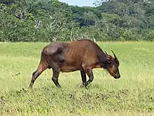 The African forest buffalo (Syncerus caffer nanus), also known as the dwarf buffalo or the Congo buffalo, is the smallest subspecies of the African buffalo.[1] It is related to the Cape buffalo (Syncerus caffer caffer), the Sudan buffalo (Syncerus caffer brachyceros), and the Nile buffalo (Syncerus caffer aequinoctialis). However, it is the only subspecies that occurs mainly in the rainforests of central and western Africa with an annual rainfall around 1,500 mm.[2]