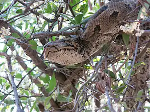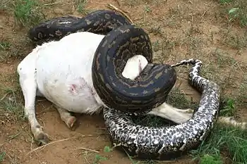 Like all pythons, the African rock python is non-venomous and kills by constriction.[5][24] After gripping the prey, the snake coils around it, tightening its coils every time the victim breathes out. Death is thought to be caused by cardiac arrest rather than by asphyxiation or crushing.[5] The African rock python feeds on a variety of large rodents, monkeys, warthogs, antelopes, vultures, fruit bats, monitor lizards, crocodiles, and more in forest areas,[12] and on rats, poultry, dogs, and goats in suburban areas. It will sometimes take fish as well.[28] Occasionally, it may eat the cubs of big cats such as leopards, lions, and cheetahs, cubs of hyenas, and puppies of wild dogs such as jackals and Cape hunting dogs.. However, these encounters are very rare, as the adult cats can easily kill pythons or fend them off.[29][15] On March 1, 2017, a 3.9-m (12-ft. 10-in) African rock python was filmed eating a small adult female spotted hyena weighing 50 kg (120 lb). This encounter suggests that the snake might very well be capable of hunting and killing larger and more dangerous animals than previously thought.[30] The largest ever recorded meal of any snake was when a 4.9m African Rock Python consumed a 59-kg impala.[31]