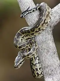 The generic name, Python, is a Greek word referring to the enormous serpent at Delphi slain by Apollo in Greek mythology. The specific name, sebae, is a latinization of the surname of Dutch zoologist, Albertus Seba.[8][9] The subspecific name, natalensis, refers to the Natal region of South Africa. Common name usage varies with both the species and northern subspecies referred to as African rock python or simply rock python. The southern African rock python is sometimes referred to as the Natal rock python[8] or the African python.[10]