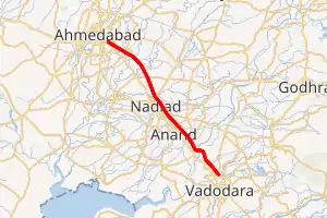 The Ahmedabad Vadodara Expressway or Mahatma Gandhi Expressway or National Expressway 1 is an expressway connecting the cities of Ahmedabad and Vadodara in the state of Gujarat, India.[1] The 93.1 km (57.8 mi) long[2] expressway reduces the travel time between the two cities[3] from two and a half hours to an hour.[4] It was declared as National Expressway 1 in 1986.[5]