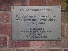 A brass plaque remembering the event is now located in Middle Ride, close to the crash scene, which was erected on the 10th anniversary of the accident by the Willenhall Wood Residents Association.[3]