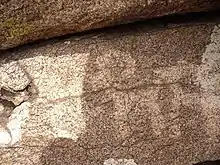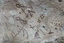 There are paintings on the walls of the cave drawn in brown ocher, dating to approximately 3000 BC. The content of the paintings is complex, and includes shapes like triangles and rectangles, lines, dots, and images of people.