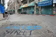 While there are no official signs, al-Shuhada Street is the official name of the street,[1][2] meaning Martyrs Street. Israelis call it "King David Street".[3] In 2011, Palestinians temporarily renamed the street to "Apartheid Street". Explaining the change, Rafiq al-Jabari, aide to Hebron's Governor, said that the change would remain in place "until the end of the Apartheid segregation that is enforced by the settlers under the protection of occupation soldiers".[4]