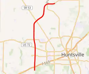 | Huntsville | 0.000 | 0.000 | Rideout Road | Redstone Arsenal Gate 9; southern terminus | |