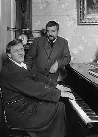 In Petersburg Kuprin found himself in the center of Russian cultural life. He became friends with Anton Chekhov whom he regularly corresponded with up until the latter's death in 1904, often seeking his advice.[17] Kuprin's friendship with Ivan Bunin would last almost forty years, continuing in emigration.[18] Another important figure for Kuprin was the scholar and critic Fyodor Batyushkov of Mir Bozhiy; the 150 letters that are extant represent a minor part of their vast correspondence.[19] Later Kuprin expressed much gratitude to Viktor Mirolyubov[20][21] who, as well as Maxim Gorky, exerted strong influence upon his career.[17][22][23]