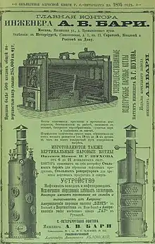 In a few years, the company produced a special steam boiler, designed by Vladimir Shukhov. To mass-produce the invention, Bari built the A. V. Bari Boiler Plant in Tyufeleva Roscha of the Danilovsky District. It became operational in February 1884. In five years since its foundation ‘Bari Technical Company’ assets included the boiler plant in Moscow and several branch offices in Saint Petersburg, Kharkiv, Nizhny Novgorod, and Yekaterinburg.[4]