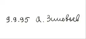 From the mid-1990s, Zinoviev began to visit his homeland more often, he had supporters and followers with whom he willingly communicated. In 1996, he confessed that he was not going to return to Russia that was "hostile", despite the publication of his books (Embroilment, Russian Experiment, etc.). He believed that he was "boycotted" in Russia, as, incidentally, in the West, where he managed to publish with difficulty. Nevertheless, in France, in the publishing house "Plon" in 1996 "West" was released, two years later in Italy it became the bestseller "The Global Humant Hill". As Pavel Fokin writes, the turning point was the fall of 1997, when he visited Russia several times. Zinoviev represented the "Global Humant Hill" in Moscow, held a series of meetings with Sergey Baburin, Nikolai Ryzhkov and Gennady Zyuganov.[3] Zinoviev called for a vote for the Communist leader in the 1996 presidential election, considering the Communist Party of the Russian Federation one of the few positive political forces in the country,[4] although his position was more radical than that of the parliamentary Communist opposition. Zinoviev's 75th anniversary was celebrated at the Presidium of the Academy of Sciences and at the Institute of Philosophy; he visited his native Kostroma Region, and in 1998 made a number of trips around Russia and the CIS. On June 30, 1999, the Zinoviev family returned to Moscow. A few days later he was accepted as a professor at Moscow State University (Department of Ethics at the Faculty of Philosophy) and Maxim Gorky Literature Institute. At the end of the year, at the suggestion of Baburin, he agreed to participate in the Duma elections on the list of the Russian All-People's Union, but was not registered.[3]