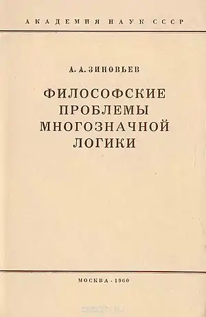 The first publications took place in 1957, a year later one of the articles was published in Czech. For fifteen years (1960–1975) Zinoviev published a number of monographs and many articles on non-classical logic. Academic career developed rapidly: in 1960, Zinoviev became a senior researcher, in November 1962, by unanimous decision of the Academic Council of the Institute of Philosophy of the Academy of Sciences of the Soviet Union, received a doctorate for his study "The logic of statements and the theory of inference". Opponents of the defense were Valentin Asmus, Sofya Yanovskaya and Igor Narsky. In 1958–1960, he read the special course "The Philosophical Problems of Natural Science" at the Moscow Institute of Physics and Technology, since 1961 – the special course at Moscow State University (faculty of philosophy). In 1966 he received the title of professor, in 1967–1968, part-time headed the department of logic, Faculty of Philosophy, Moscow State University. In 1968, he joined the editorial board of the journal Problems of Philosophy, a year later – on the Academic Council on the problems of dialectical materialism of the Institute of Philosophy of the Academy of Sciences of the Soviet Union. By the mid-1970s, his works were published in English, German, Italian, and Polish. Zinoviev was engaged in logic not just as a scientific discipline, but reconsidered its foundations as part of the creation of a new field of intellectual activity.[3] According to Konstantin Krylov, he experienced a temporary stage of creating a "general theory of everything", which, however, he quickly passed. It is noted that in logical studies Zinoviev was clearly vain, which led to imprudent steps and embarrassment: for example, he insistently published proof of Fermat's unprovability in the framework of the logical system he built.[4]