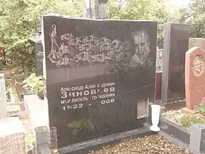 Alexander Zinoviev died on May 10, 2006 from a brain tumor. According to Maxim Kantor, in the last conversation he discussed the dehumanization of European culture, arguing that only the revival of humanism could save Russia.[3] According to the testament, he was cremated, the ashes were scattered from a helicopter over the Chukhloma Region, where Zinoviev was born and grew up, a boulder was installed at this place. In memory of the merits before the Russian culture, a symbolic grave-cenotaph was erected at the Novodevichy Cemetery in Moscow.[16] Posthumously, Zinoviev was awarded the title "Honorary Citizen of the Kostroma Region". In 2009, a monument to Zinoviev was erected in Kostroma, on the territory of Nikolai Nekrasov Kostroma State University (sculptor Andrey Kovalchuk).[21] In 2016, on the eve of the 95th anniversary of Zinoviev, a new species of butterflies was named in his honor – "Zinoviev's Fan Wing" (Alucita zinovievi).[22]